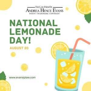 Happy #NationalLemonadeDay! We don’t want you feeling sour when you realize someone else has already trademarked your brand name. Let’s get your #IP protected. #TradeSecret #EvansIPLaw #patent #trademark #copyright