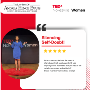 #TEDx #SilencingSelfDoubt #YouBelong #BlackWomenLead #Motivation #TEDxSpeaker #evansiplaw #Authenticity #nowtonow #tedxnokesville #patent #trademark #copyright #thankyou