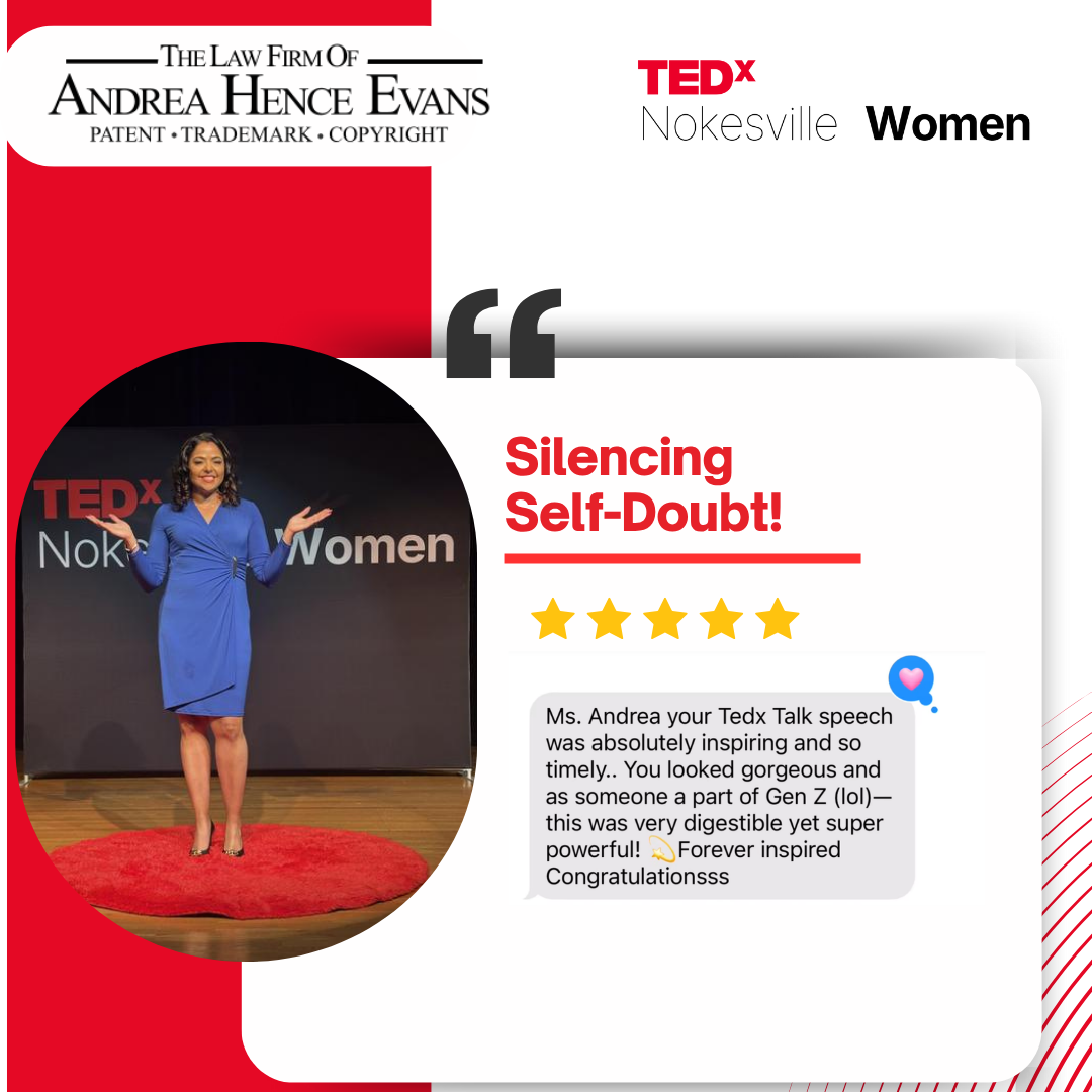 #TEDx #SilencingSelfDoubt #YouBelong #BlackWomenLead #Motivation #TEDxSpeaker #evansiplaw #Authenticity #nowtonow #tedxnokesville #patent #trademark #copyright #thankyou