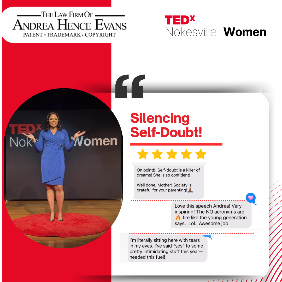 #TEDx #SilencingSelfDoubt #YouBelong #BlackWomenLead #Motivation #TEDxSpeaker #evansiplaw #Authenticity #nowtonow #tedxnokesville #patent #trademark #copyright #thankyou