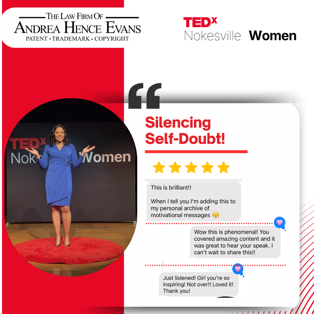 #TEDx #SilencingSelfDoubt #YouBelong #BlackWomenLead #Motivation #TEDxSpeaker #evansiplaw #Authenticity #nowtonow #tedxnokesville #patent #trademark #copyright #thankyou