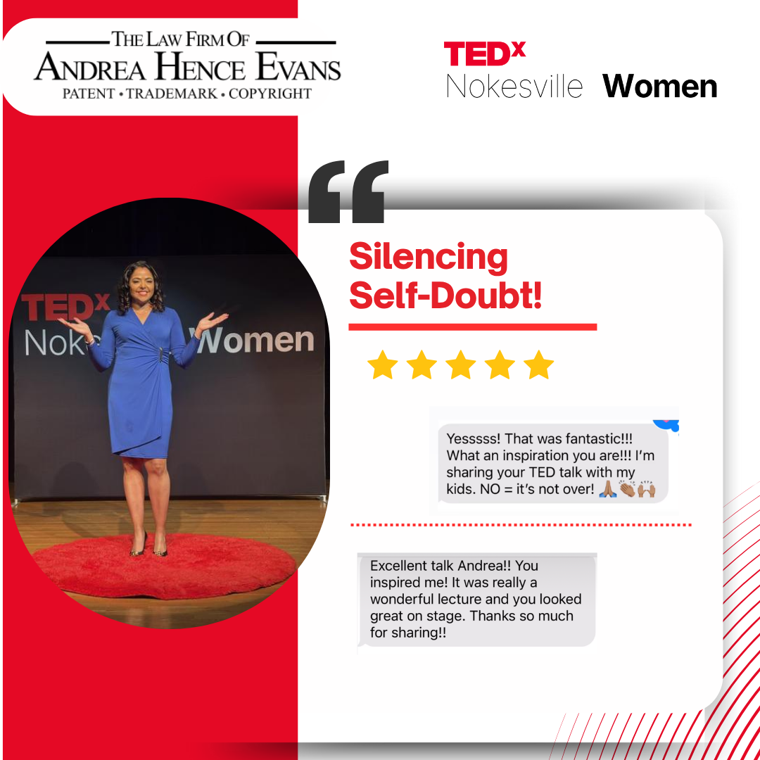 #TEDx #SilencingSelfDoubt #YouBelong #BlackWomenLead #Motivation #TEDxSpeaker #evansiplaw #Authenticity #nowtonow #tedxnokesville #patent #trademark #copyright #thankyou