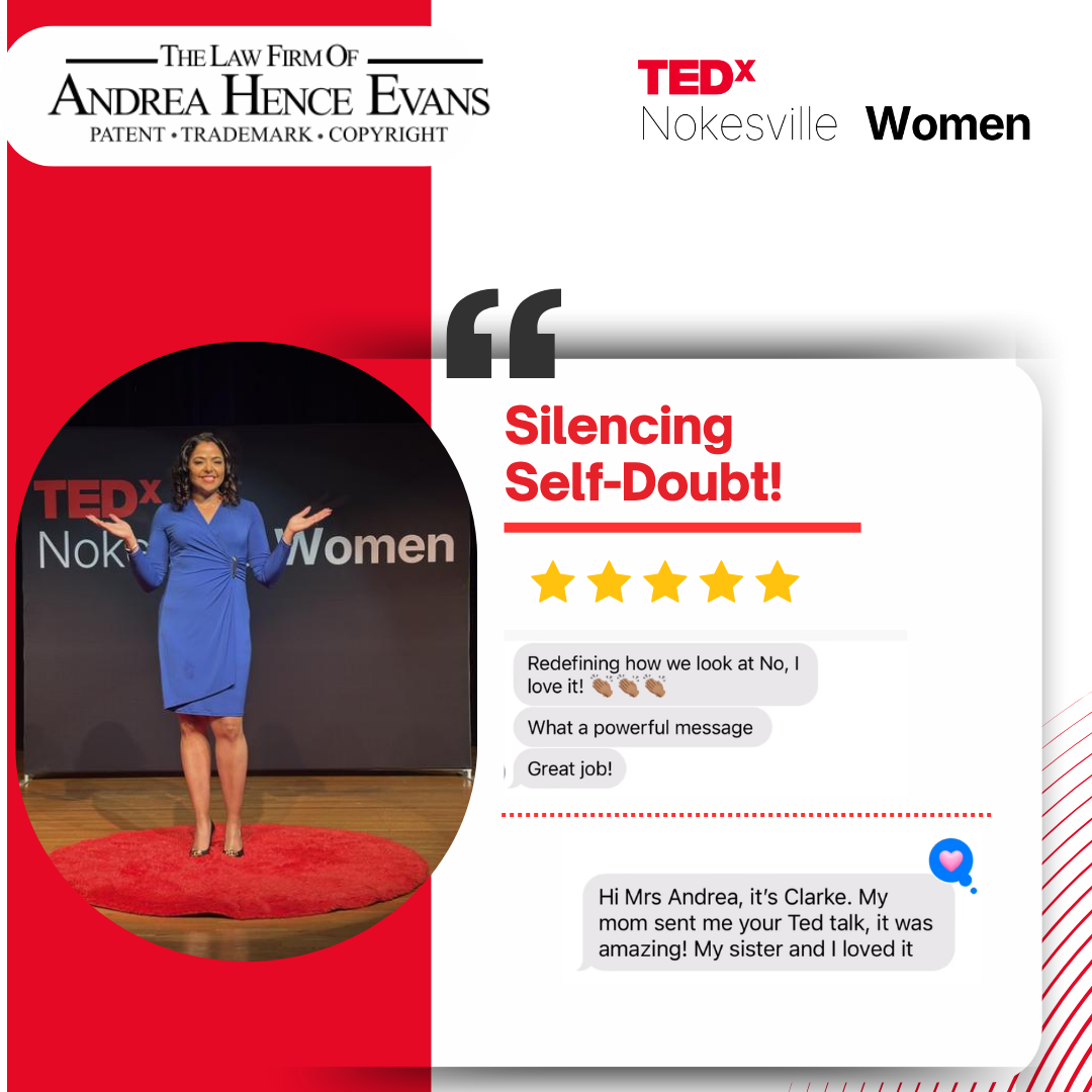 #TEDx #SilencingSelfDoubt #YouBelong #BlackWomenLead #Motivation #TEDxSpeaker #evansiplaw #Authenticity #nowtonow #tedxnokesville #patent #trademark #copyright #thankyou